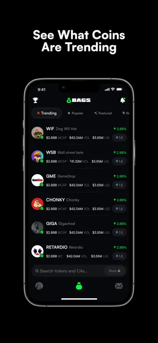 Bags makes memecoin trading simple, social, and fast by combining portfolio tracking, real-time charts, and trending tokens in one app. Users can deposit easily with Apple Pay or wallets, discover what's pumping, and trade instantly. Bags lets you see what friends are buying and trade together in real time. It's designed for memecoin traders who want speed, visibility, and community in one place.