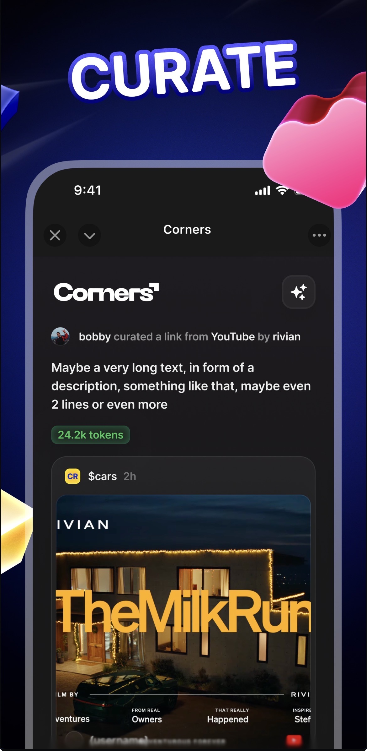 Corners is a platform for curating the best of the internet. Each corner is a collection of links, conversations, and people around a specific topic. Every corner becomes a tradeable coin, where buying coins lets you upvote links and surface the best content. Curators and coin holders earn together as valuable links rise to the top.
