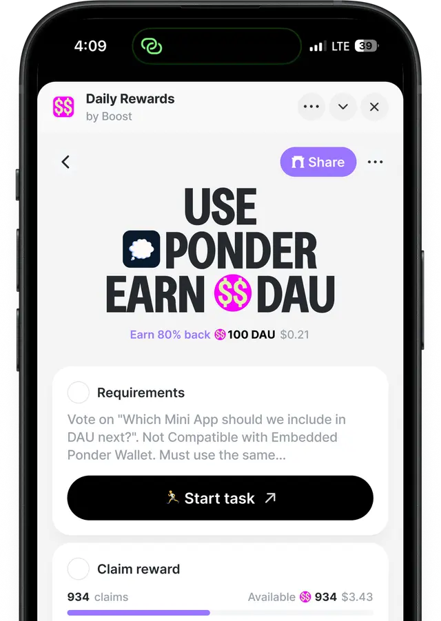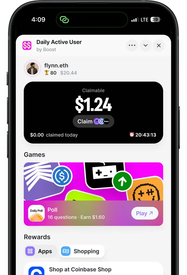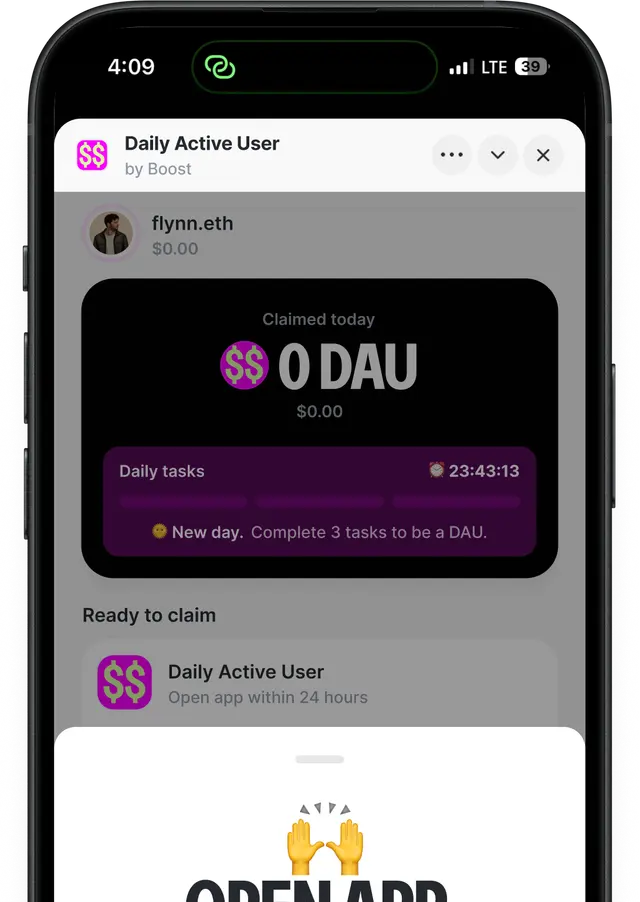 Daily Active User is a Farcaster mini app by Boost that rewards users in tokens for completing simple daily actions across the Farcaster ecosystem. Use supported mini apps, complete tasks, and claim rewards directly in-app. It turns everyday activity into onchain incentives, making participation across Farcaster more engaging and rewarding.