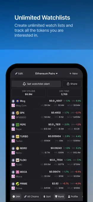 - Customizable screeners with several metrics such as volume, price change, liquidity and market cap
