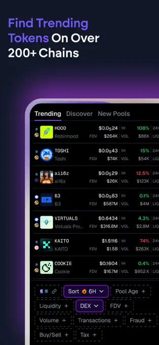 GeckoTerminal is a DeFi and DEX aggregator that tracks real-time cryptocurrency prices, trading volumes, transactions, and liquidity data across decentralized exchanges. GeckoTerminal offers advanced charting tools and analytics to assist traders in making informed decisions.
