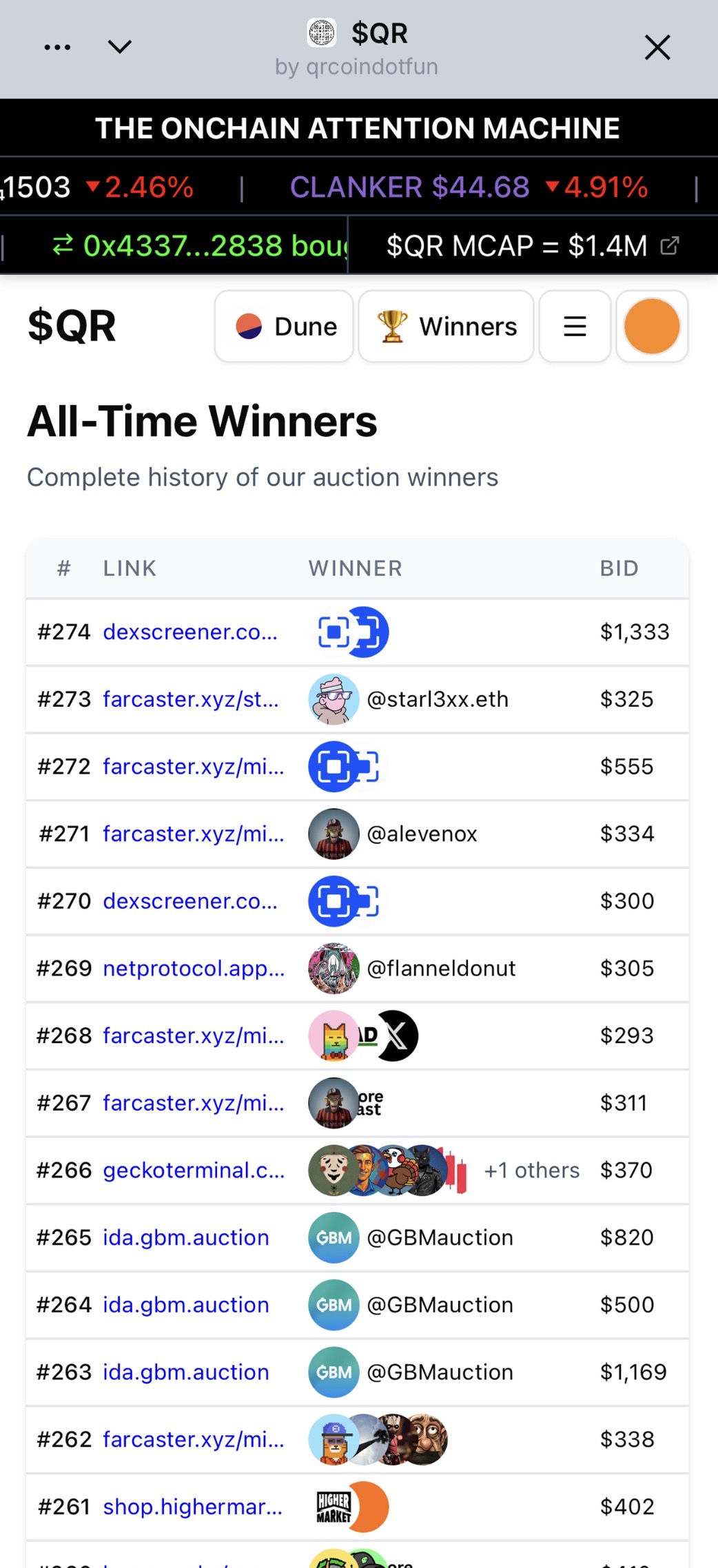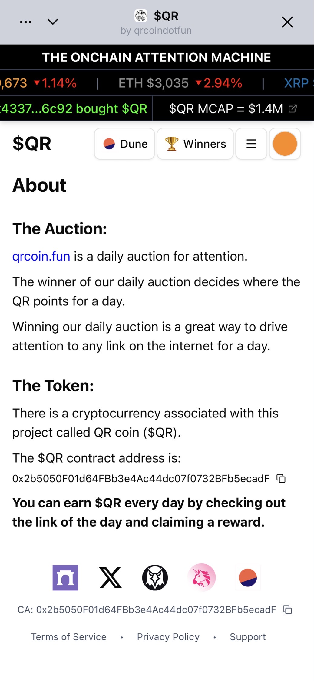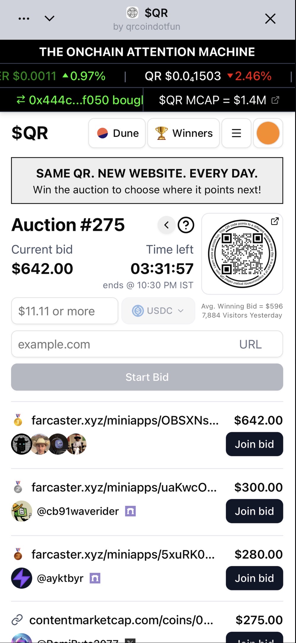 qrcoin.fun is a daily auction for attention. The winner of our daily auction decides where the QR points for a day.Winning our daily auction is a great way to drive attention to any link on the internet for a day. There is a cryptocurrency associated with this project called QR coin ($QR). You can earn $QR every day by checking out the link of the day and claiming a winning reward