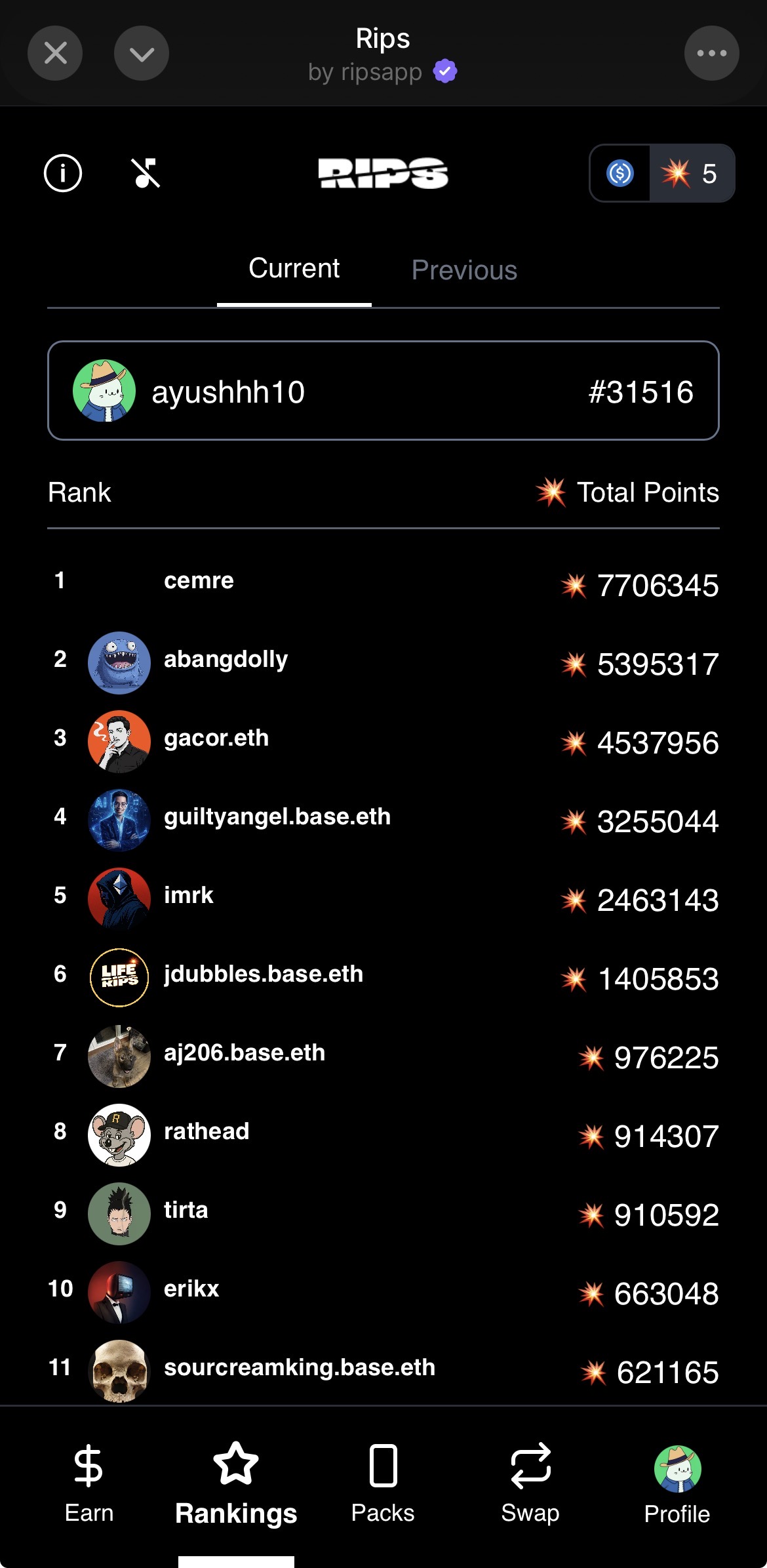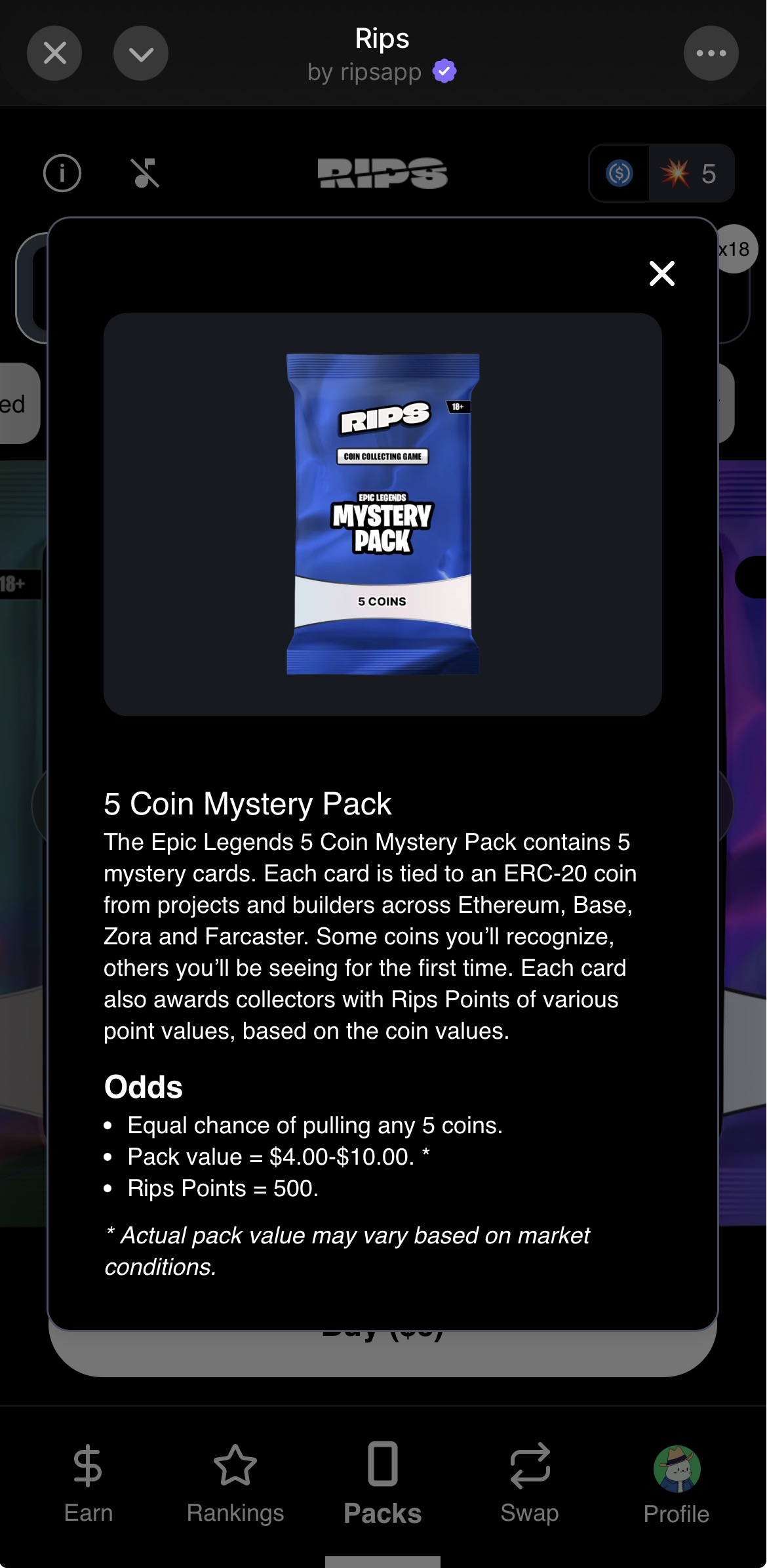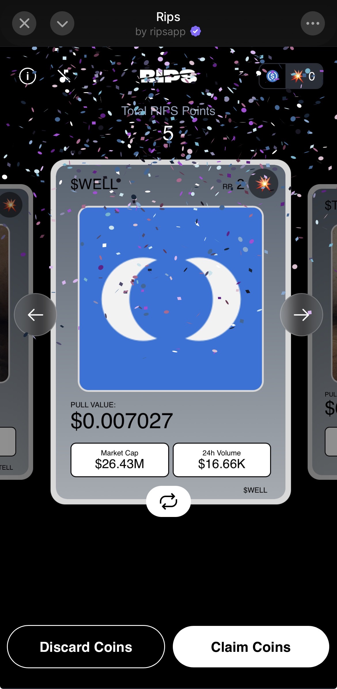 Rips is a gamified crypto app where you "rip open" digital packs to reveal cards tied to real ERC-20 coins. Every day, you get one free rip, with the option to buy more with USDC. Rips collaborates with top crypto communities and projects to bring a fun twist to coin collecting and discovery.