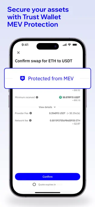 Trust Wallet is a secure multi-chain self-custody wallet trusted by over 200 million users. Supporting 100+ blockchains and 10+ million digital assets, it serves as your gateway to Web3, DeFi, and NFTs. Features include built-in token swaps, staking rewards, a dApp browser for accessing decentralized applications, and easy crypto purchases via credit card, Apple Pay, and Google Pay. Your private keys are stored securely on your device with AES encryption—Trust Wallet never has access to your funds or personal data.
